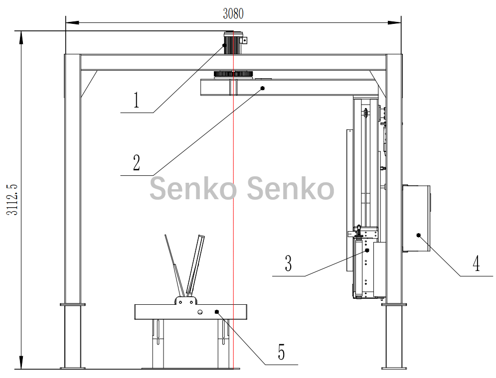 | 1,Rotary Motor | 2,Rotary Rack | 3,Lifting Rack | 4,E-control Cabinet | 5,Film cutter |