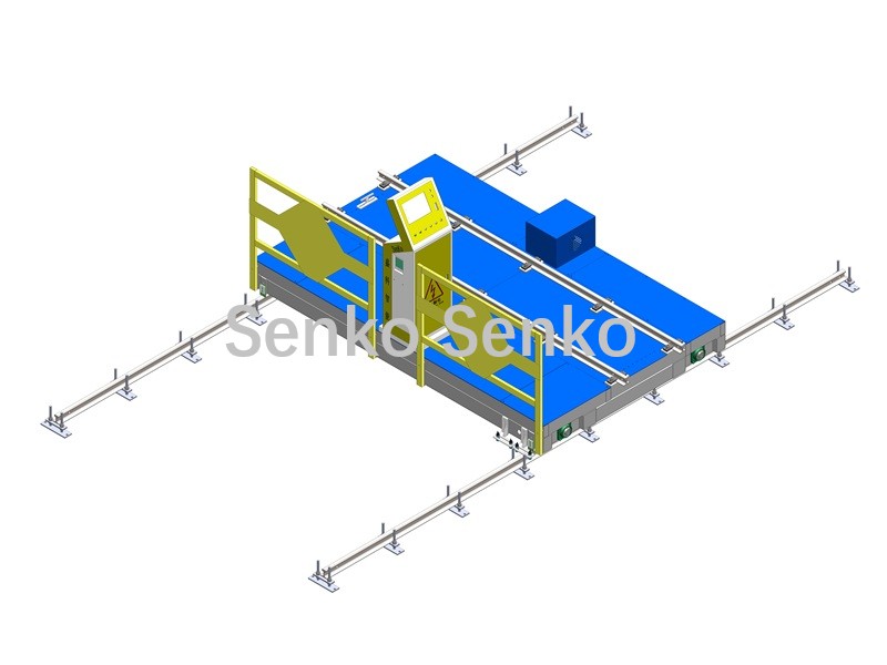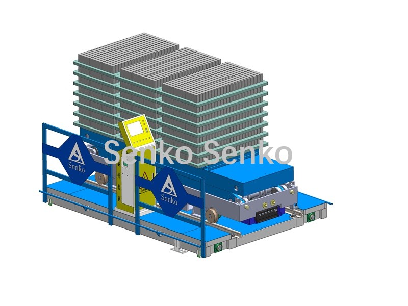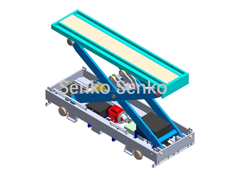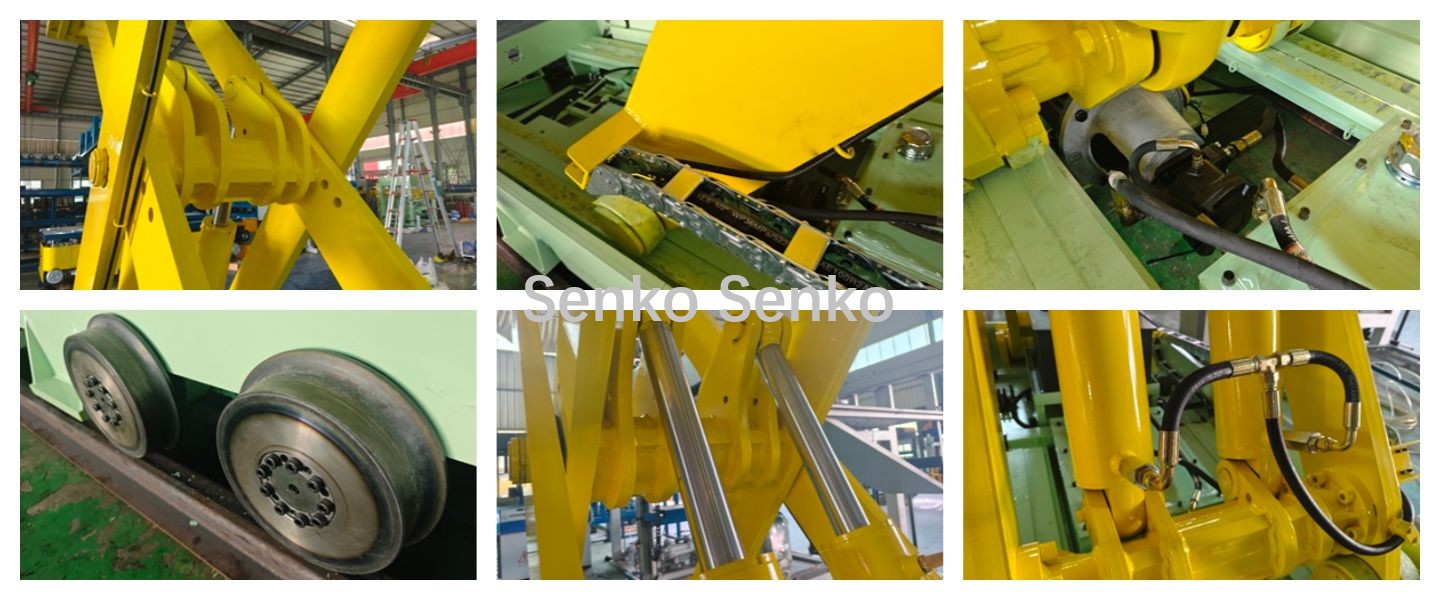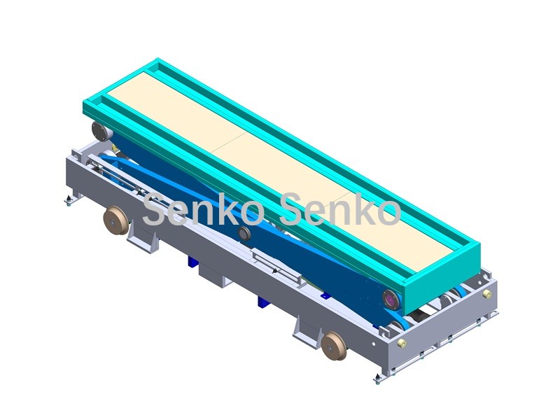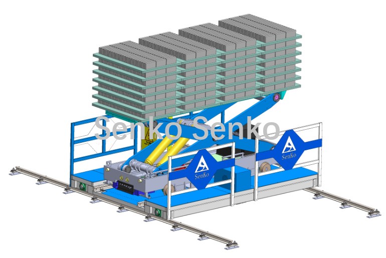 The lifting mechanism on the transport trolley raises the item, and the trolley travels to the designated position according to the preset target. It then lowers to set the item down, thus transferring the item from one location to another, i.e., item transfer. (When the multi-level transport trolley is raised, it can stop at multiple different heights to meet the storage and retrieval needs of multi-level curing kilns.)