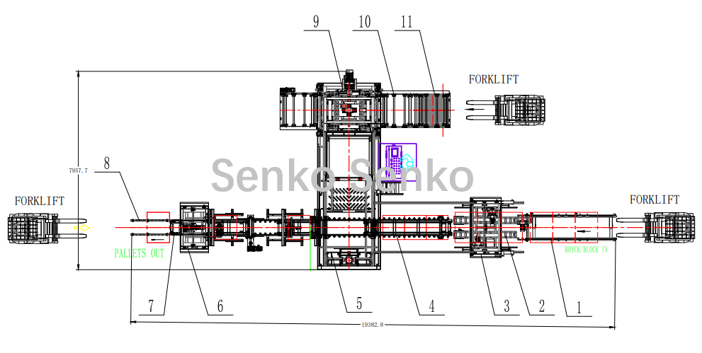 The brick boards brought by the forklift, each pallet loaded with cured bricks/blocks, are conveyed to the pallet lifting reservation area. The lifting machine sequentially grabs the brick pallets layer by layer, front and back, up and down, and sends them to the conveyor before bricks/blocks-pallet separation.