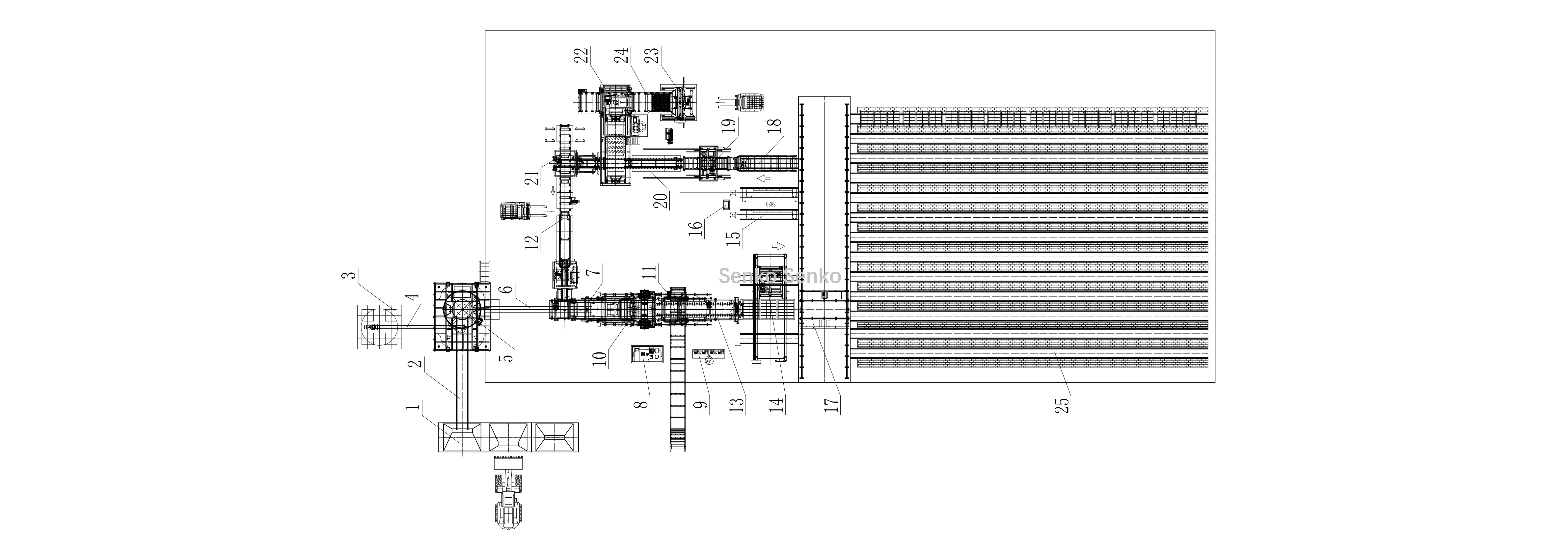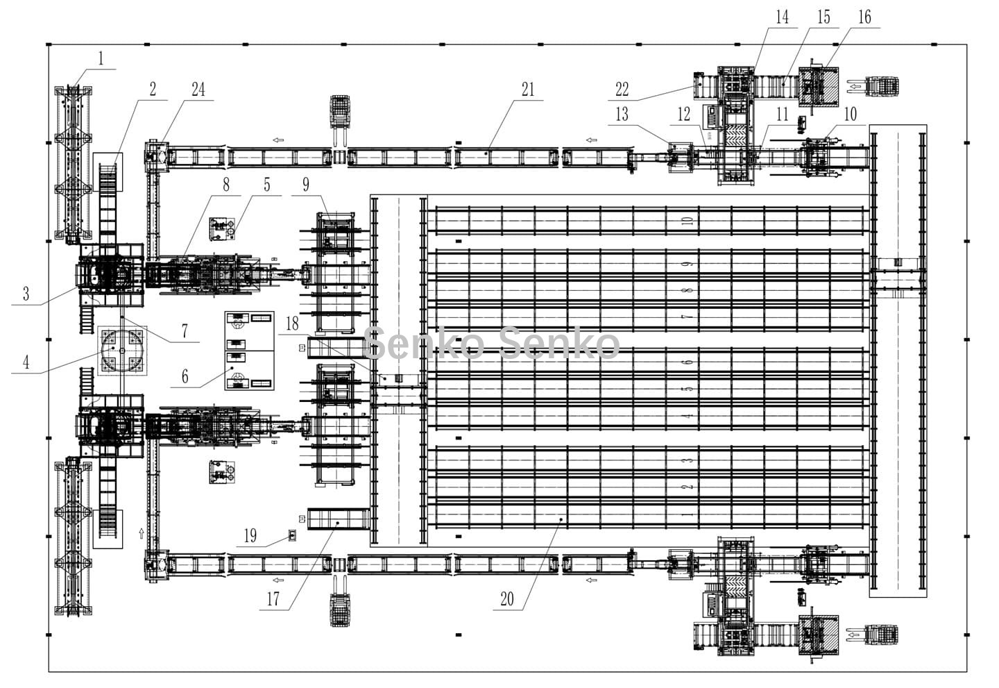 | 21, Palletizer | 22, Brick stacking machine | 23, Lower rotary packing | 24, Stack conveyor | 25, Curing kiln |