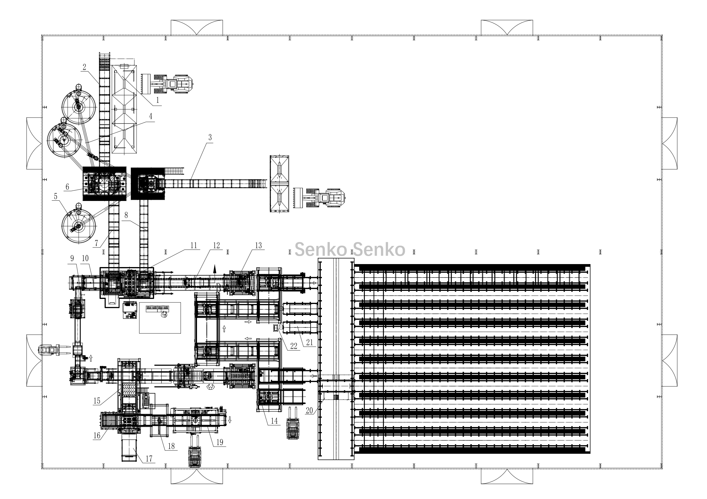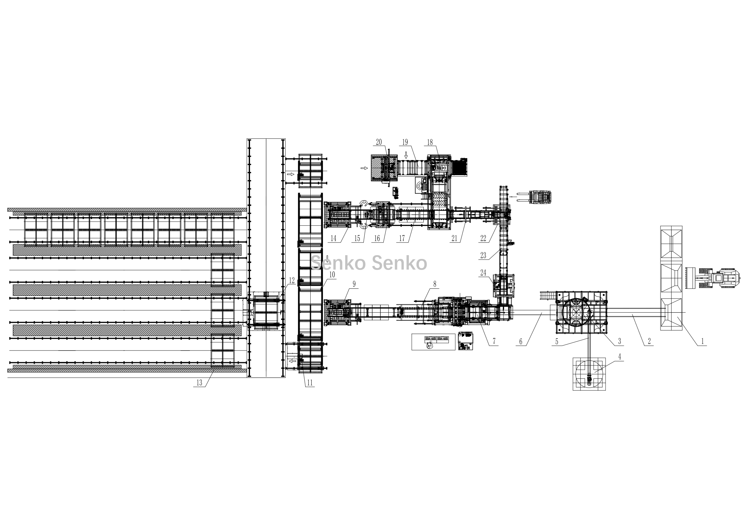 | 19, Stack conveyor | 20, Packing stripping machine | 21, Empty pallet conveyor | 22,Palletizer | 23, Pallet stack conveyor | 24, Pallet loading |