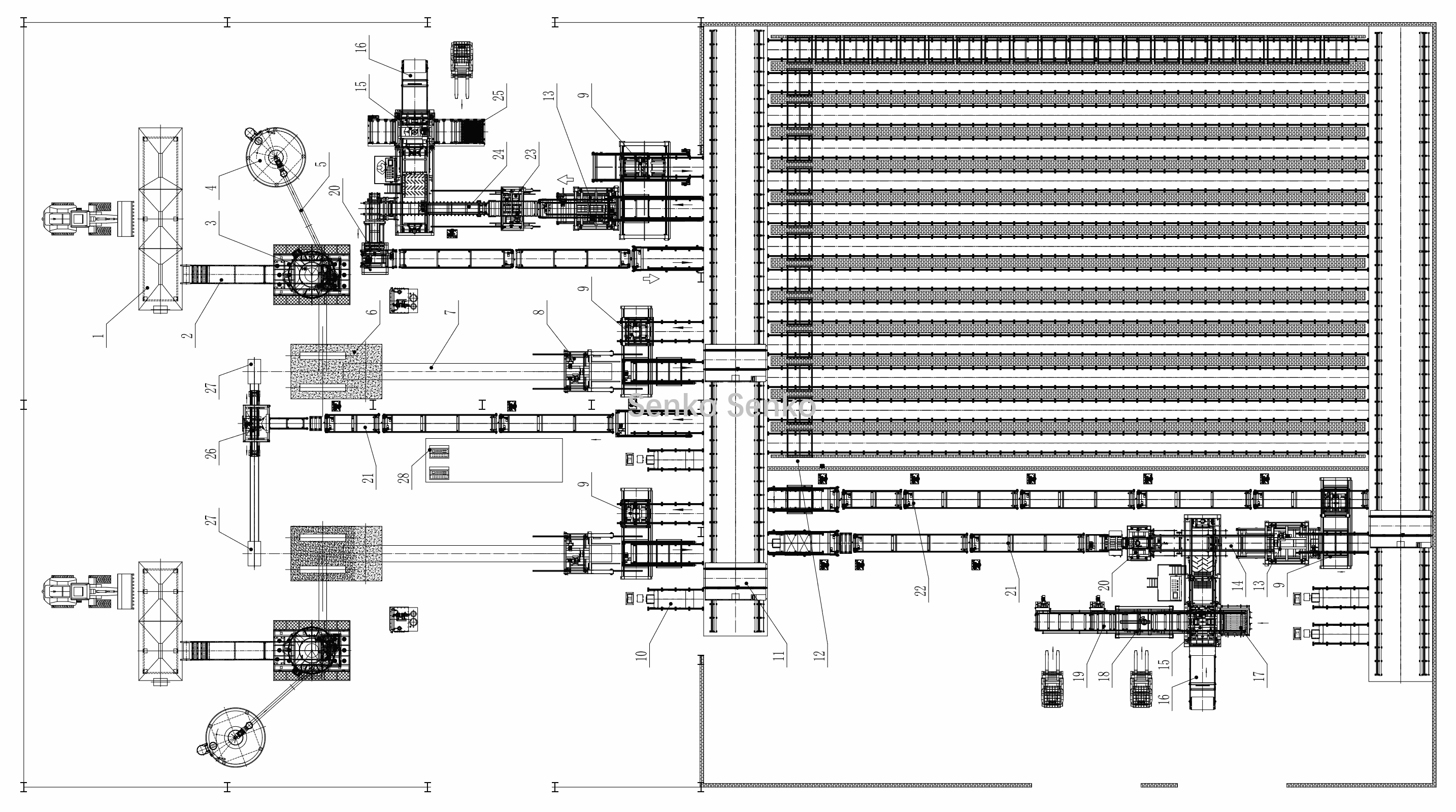 | 25, Stripping machine | 26,Pallet feeding onto the line | 27, Pallet storage frame |